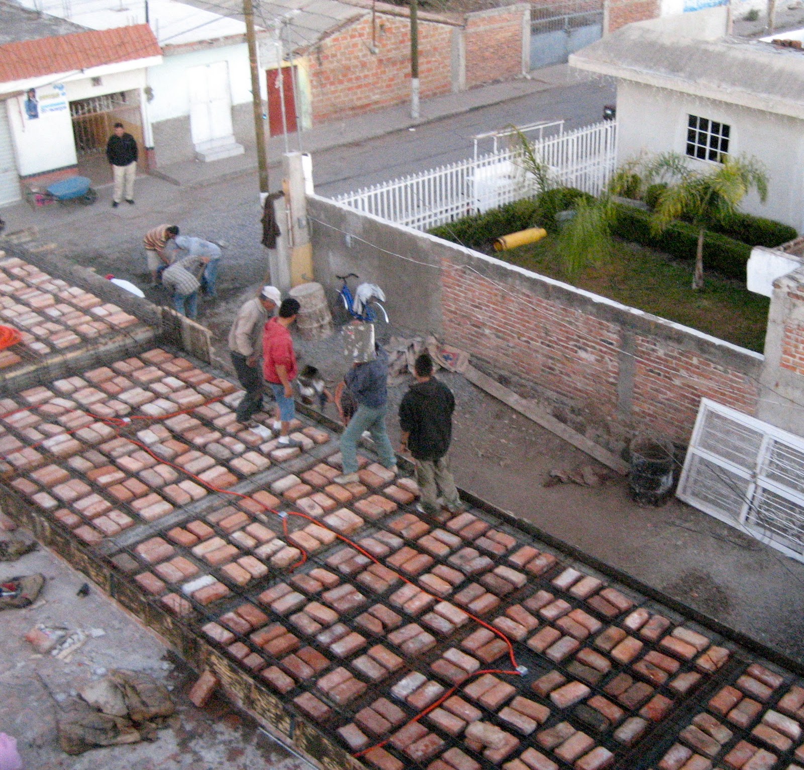 It was a big colado (usually pronounced “kolau”, to rhyme with cow). A colado is the cement roof on most brick houses. The concrete is poured into wooden frames over bricks that have been placed in the frames. The dozen men were doing the job that in the US would be done by a big cement truck. First they would mix the cement with sand and gravel, in the street. They made two big circles right there in front of our house. When the maestro gave the sign, they carried their botes full of water to the chosen circle, and a couple of them began to mix the diferent elements for the colado. When it was ready, each man approached the mixed concrete and filled his bote, then hurried over to the wall, and heaved his bote up to the one man who would handle each one for the duration of the pouring. He handed each bote to another man, who either handed it to a second man on the roof, or poured it in the right spot.